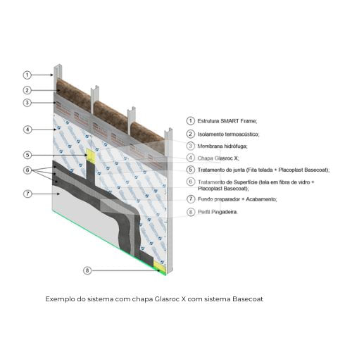 A placa de fachada Glasroc é feita com material resistente, ideal para ambientes externos. O produto é fabricado com aditivos especiais e revestido por um véu de vidro, composto de polimérico nas duas faces. Aguenta o mofo, raios UV, umidade e demais condições climáticas.